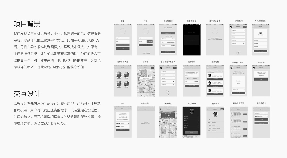 我们发现货车司机大部分是个体,缺乏统一的后台信息服务系统,导致他们的运输效率非常低。比如从A地到B地卸货后,司机在异地很难找到回程货,导致成本极大。如果有一个信息服务系统,让他们运输节奏紧凑的话,他们的收入可以提高一倍。对于货主来说,他们找到回程的货车,运费也可以降低很多。这就是零担速配设计的核心价值。我们发现货车司机大部分是个体,缺乏统一的后台信息服务系统,导致他们的运输效率非常低。比如从A地到B地卸货后,司机在异地很难找到回程货,导致成本极大。如果有一个信息服务系统,让他们运输节奏紧凑的话,他们的收入可以提高一倍。对于货主来说,他们找到回程的货车,运费也可以降低很多。这就是零担速配设计的核心价值。
